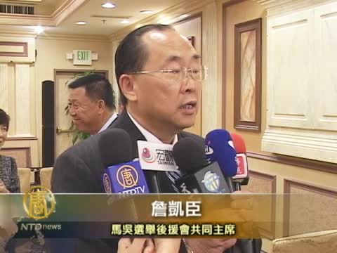 共同主席詹凱臣說明成立原因。馬吳選舉後援會共同主席詹凱臣:「北美洲總會成立,是由於我們在海外居住的一群臺商臺僑,平時非常支持中華民國,也非常關心台灣的事情,所以呢我們有志一同,自動自發的組成了,這個競選的後援會。」