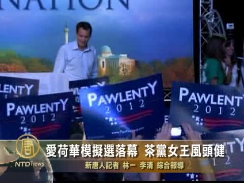 【新唐人2011年8月15日訊】競爭美國2012總統大選候選人資格的共和黨人在愛荷華州的模擬初選結束後有進有退,號稱「 茶黨女王”的國會女議員巴赫曼以得票率29%贏得最多投票,明州前州長波倫蒂則在星期日宣佈退出競選。