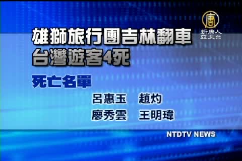 【新唐人亞太台2011年8月15日訊】來看一則不幸的意外消息。雄獅旅行社到大陸「東北長白山8日遊」行程的旅行團,今天(15號)在吉林發生翻車意外,造成4名台灣遊客死亡、多人受傷,雄獅旅行社稍早公布了死亡名單,分別為呂惠玉、趙灼、廖秀雲和王明瑋。雄獅旅行社發言人林承曄表示,目前已經通知死者家屬,將在明天(16)日協助家屬前往當地處理後事,另外,現也已經將其餘受傷的14名旅客和1名領隊送至醫院救治。