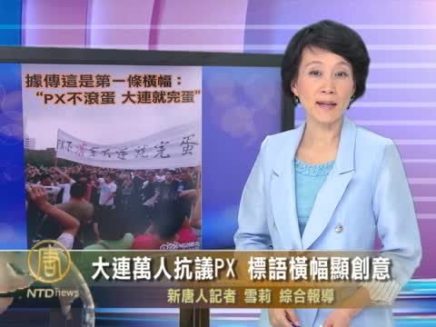 【新唐人2011年8月17日訊】8月14日,大連近八萬民眾上街遊行示威,抗議福佳大化PX項目將毒工廠建在市區內。在示威活動中,人們製作的各式各樣表達不滿的橫幅、標語,也相當有創意。下面請看雪莉的報導。