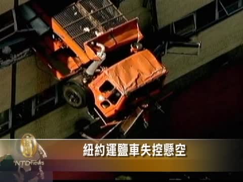 【新唐人2011年8月18日訊】紐約一輛運鹽卡車的司機駕駛時失去控制,撞穿了皇后區一個停車場的牆,吊在二樓半空, 只有後輪還在裡面。司機很快被救出,但是這輛15噸的卡車懸空好幾個小時,撞牆撒下來的碎片砸到下面的小車上。目前還不知是甚麼原因使司機失控。
