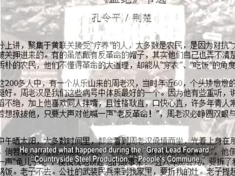 孔令平:「我坐監獄一共是20年,判了兩次死刑,和我一起反抗毛澤東的那個暴政的那些人,都已經死去啦。槍斃的就是5個人,5個人前前後後的死去啦。我應該把這個歷史如實的記載下來。雖然那僅僅是我個人的經歷,同時也是真實的反應了那些流放的右派,他們鬥爭的經歷。 」