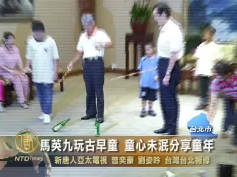 【新唐人2011年8月18日訊】馬英九今天(18日)在總統府內接見被稱為童玩達人的張文雄老先生。對於台灣早期利用生活中的廢棄物品做成的玩具,馬英九總統感到非常好奇,還在記者會現場玩起了這些古早童玩。