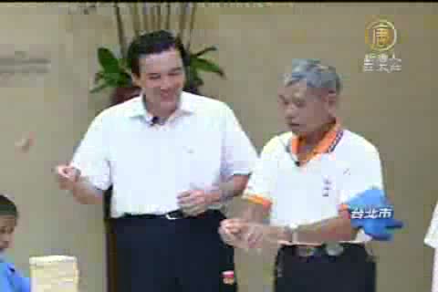 【新唐人亞太台2011年8月19日訊】馬總統出席完美食展開幕,接下來則是接見來自台中有童玩達人之稱的張文雄老先生。看到許多台灣早期利用生活中的廢棄物品做成的玩具,馬英九總統感到非常好奇,還在記者會現場玩起了這些古早童玩 。