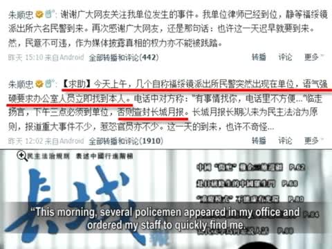 北京《長城月報》雜誌總編朱順忠17號在微博發佈求助消息說:今天上午,幾個自稱福綏鏡派出所民警突然出現在單位,語氣強硬要求辦公室人員立即找到本人。否則查封《長城月報》。