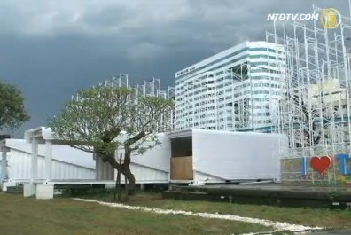 主場館設計者邱文傑:「用大概一兩千個鷹架,組合成為一條巷弄,然後在這條巷弄裡面,我們會有幾家店,都是幸福咖啡、幸福腳踏車店、幸福生機廚房、幸福冰店,用這些小市民的這些店,來把後像的生活區的感覺,把它營塑出來。」