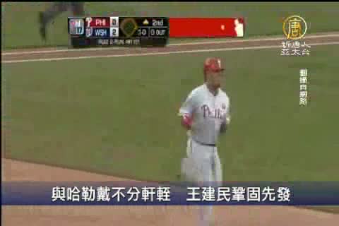 【新唐人亞太台2011年8月22日訊】美國職棒大聯盟台灣投手王建民和哈勒戴(Roy Halladay)今天第5度先發對壘,彼此都無關勝敗,雙方對戰成績留在各1勝1敗。華盛頓國民隊的王建民今天先發5.2局,被敲5支安打,包含2發全壘打,出現1次保送、4次三振,丟掉3分自責分。面對戰績全聯盟第一的費城人,王建民還能繳出不錯的成績,《華盛頓郵報》稱讚他與費城王牌哈勒戴(Roy Halladay)表現不相上下;另外,如此傑出的表現,也讓總教練強森相當滿意,表示今年剩下的例行賽,王建民都將以先發之姿出賽,等於宣告這名台灣右投,確定穩固輪值地位 。