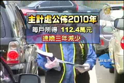 【新唐人亞太台2011年8月22日訊】根據主計處最新的統計資料顯示,去年國內所得最低20%的156萬戶家庭,每天生活入不敷出,平均每戶透支2萬多元,創下歷史次高紀錄,民眾說,現在的錢比以前難賺,生活實在辛苦。