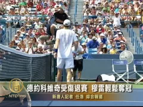 【新唐人2011年8月22日訊】星期天(8月21號),美國辛辛那提網球大師賽(ATP Cincinnati Masters)的冠軍爭奪賽,英國好手穆雷(Andy Murray),因為對手,世界頭號種子德約科維奇(Novak Djokovic)肩膀受傷退出比賽而輕鬆奪冠。