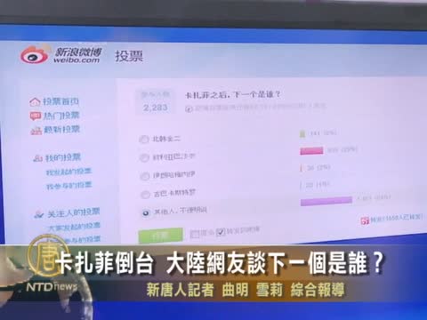 【新唐人2011年8月24日訊】近日來,利比亞卡扎菲獨裁政權的垮臺在大陸互聯網上引起熱議,網友們在微博上發起投票:「卡扎非之後,下一個是誰?」 投票的結果是甚麼?請看雪莉的詳細報導。