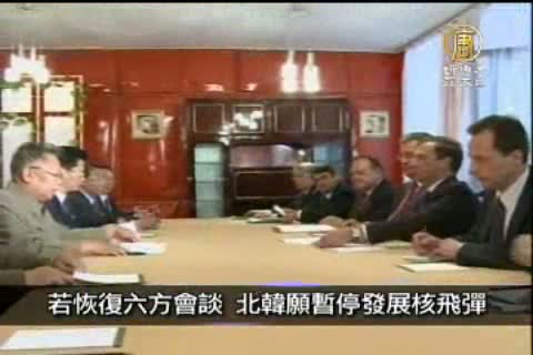 北韓領袖金正日今天在俄羅斯西伯利亞,與俄羅斯總統麥維德夫舉行會談。金正日在會談中表示,如果能夠恢復六方會談,北韓願意暫停發展核子飛彈。