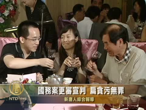 【新唐人2011年8月26日訊】前總統陳水扁已經因為龍潭購地案三審定讞,入獄服刑,但最高法院把國務機要費和洗錢案的部分,發回更審,26日上午高等法院宣判,陳水扁部分,國務機要費貪污無罪,只有偽造文書與洗錢被判刑,合併為2年10個月,吳淑珍則是因為南港展覽館弊案被判9年,縱使國務機要費也是無罪,合併卻還有11年10個月的有期徒刑。