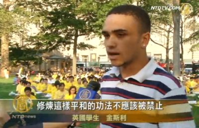 英國學生金斯利:「不管政府是不是感到受威脅,我不知道。煉這樣平和的功法不應該被禁止。他們沒有傷害任何人,只是打坐,做自己認為對的。我回去要仔細看,我覺得這是對每個人都有益的,會有啟發。不只是中國人,其他國家的人也可以從中學習。可以改善健康還有其他的一切。我認為是好的。」