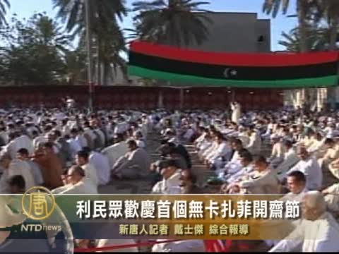 【新唐人2011年8月31日訊】星期三(八月三十一日),在利比亞前統治者卡扎菲下臺一星期後,首都的黎波里的民眾上街慶祝40多年來,第一個沒有卡扎菲的自由的開齋日。