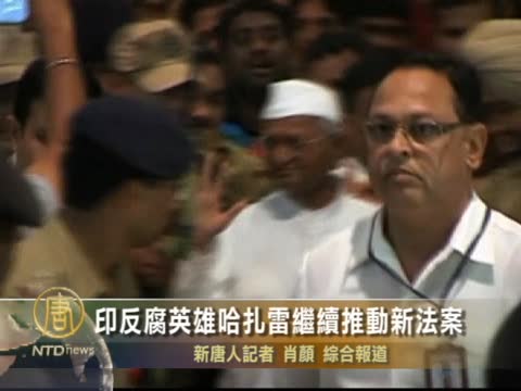 【新唐人2011年9月1日訊】印度74歲的反腐英雄安納•哈扎雷(Anna Hazare),8月31號(星期三)離開醫院,在返鄉途中,繼續推動新立法。28號,哈扎雷在得到總理接受了他的三大反腐原則後,結束了長達13天的絕食活動,並被送往醫院進行救治。