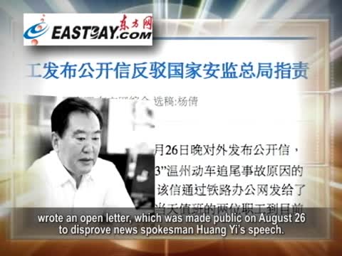 8月30號的《東方網》報導說,溫州南站電務車間全體員工8月26號晚對外發佈了一封公開信,反駁國家安監總局總工程師、新聞發言人黃毅關於溫州動車追尾事故原因的講話,認為他的講話「與事實不符、混淆職責、有失公正」。信中還提到,「7.23」事故當天值班的兩位職工到目前為止仍然被扣留。
