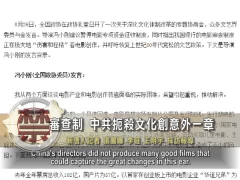【新唐人2011年9月1日訊】今年以來,大陸文化部以捍衛中國的“國家文化安全”的名義,連續發佈禁令,已經把300首中文和外文歌曲打入黑名單。一些音樂網站被指責 “擾亂網路音樂市場秩序,危害國家文化安全”。而電影導演馮小剛最近質疑中共製定的電影審查制度,認為審查制度扼殺了中國電影的創造力。下面請看專家的分析。