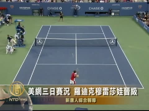 【新唐人2011年9月1日訊】美國網球公開賽星期三(8月31號)進入第三天賽程。美國網球名將羅迪克、英國好手穆雷與俄羅斯女將莎拉波娃紛紛擊敗對手,挺進下一輪比賽。