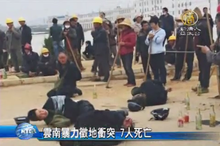 2014-10-15 21:15:30雲南昆明市晉寧縣縣政府,由於強行徵收晉城鎮富有村的2700多畝土地,遭到村民抗議。14號,開發商派出兩千多名打手,使用鋼管、催淚瓦斯等武器,鎮壓村民。衝突中,雙方至少7人死亡。