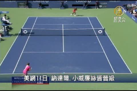 【新唐人亞太台2011年9月9日訊】美國網球公開賽8號進入第11天,「西班牙蠻牛」納達爾等待了兩天,終於擊敗盧森堡選手穆勒領到美網男單八強門票,另外喬科維奇、穆雷,跟美國女將小威廉絲也紛紛晉級四強。