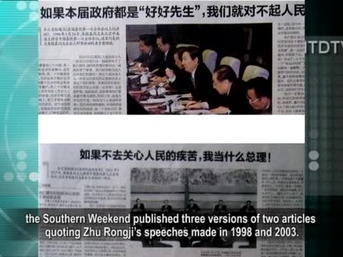 【新唐人2011年9月10日訊】中共前總理朱鎔基就任和卸任前的講話,被《南方週末》用3個版本刊登在9月8號的報紙上,標題影射性強,網友認為,文章是在暗批胡溫。當天,有市民購買報紙後發現缺了B版,有關朱鎔基講話的版面全部被抽掉。專家認為,中共體制下,黨性高於人性,最高權力者即使懷有一點善良的本性,也難以發揮,民眾不應再對中共體制下的領導人抱有幻想。