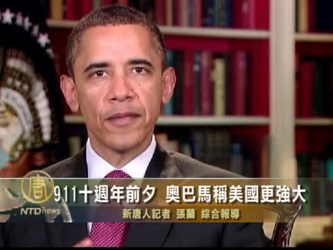 【新唐人2011年9月10日訊】星期六(9月10日),為紀念十年前發生的「911」事件,美國總統奧巴馬表示,美國在這十年間更強大了,他向這場災難的應急人員,部隊和罹難者致以敬意,並表示美國將堅持對抗恐怖份子的威脅。