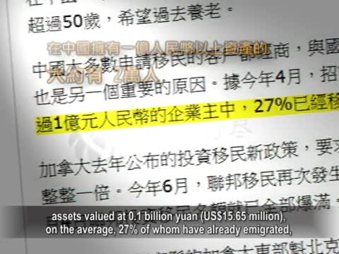 【新唐人2011年9月13日訊】越來越多的中國富人想要移民到海外,除了想要他們的子女獲得更好的教育,或者能夠享受更好的醫療系統外,主要原因是在中國一黨專政的體制下,他們擔心自己的財產。
