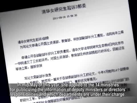 《新京報》報導,清華大學法學院女研究生李燕,要寫一篇關於各部委副部長職責分工的論文,從今年(2011年)5月中旬開始向14個部委申請,公開各部委副部長或副主任的分管部門、職責範圍等情況。