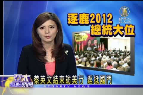 【新唐人亞太台2011年9月20日訊】民進黨總統候選人蔡英文的訪美之旅,也在今天(9/20)畫下句點,我們剛剛收到的最新消息,蔡英文一行人大約在晚間八點四十分的時候抵達桃園機場,下個月蔡英文即將前往日本,目前還未透露細節。稍後有更新的訊息,我們將為您隨時插播報導。
