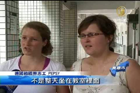 【新唐人亞太台2011年9月21日訊】很多人想學好英文,但是又不敢開口說英語。為了讓小朋友克服開口說英文的恐懼,高雄市有一所小學將學校變成英語村,讓英語不只是課堂上的教學,外籍老師會在下課時間,不定期出現在校園裡,讓小朋友主動找到她們,學習對話。