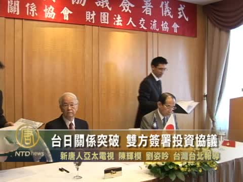【新唐人2011年9月22日訊】台灣與日本今天(22日)簽署投資協議。內容包括促進投資與投資保障,以及給予雙方投資人最惠國待遇。這項協議的簽署,不僅促進雙方產業投資的意願,也被視為雙邊關係的重要突破。