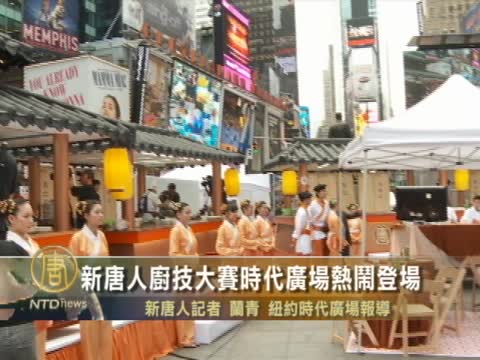 隨著一聲鑼響,紐約的時代廣場變成了大唐的長安。新唐人華人廚技大賽第四屆比賽在這裡熱鬧登場了。