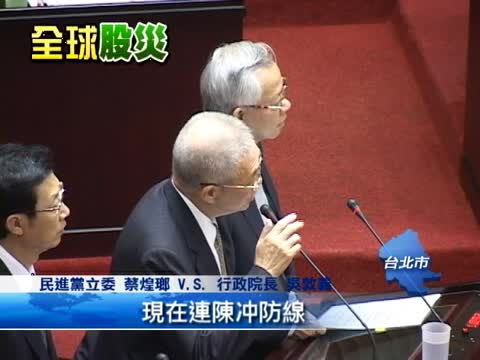 民進黨立委蔡煌瑯V.S.行政院長吳敦義:「現在連陳沖防線,都已經淪陷了」「就在五年前,也曾跌到四千多點,那時的政府有錦囊妙計嗎」「我們當時執政的時候是交九千三百點給你們,這個你要搞清楚院長」