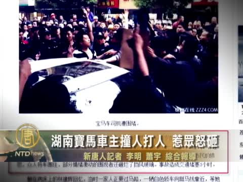 【新唐人2011年9月27日訊】繼李雙江之子駕寶馬車打人之後,中國湖南醴陵近日,再傳寶馬車主擦撞行人後打人事件,寶馬車主的囂張行徑引起公憤,民眾群情激憤砸爛了車子的擋風玻璃,最後車主在大批警力的護衛下,離開現場。