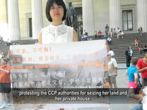 第66屆聯合國大會召開期間,來到紐約的上海訪民曾霞敏在聯合國總部前,手舉圖片告示,抗議中共搶掠她家的15畝地,強拆她家的700平米私宅。去年2月,上海江橋鎮政府派了300多警察暴力強拆,曾霞敏三顆門牙被打落,她的母親和奶奶被打傷。