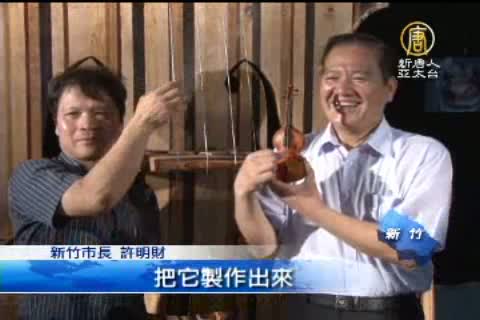 「余榮華老師用了將近一年多的時間,把這一把520公分高,就是5公尺多的大提琴把它製作出來,今天這把琴代表新竹的驕傲。」