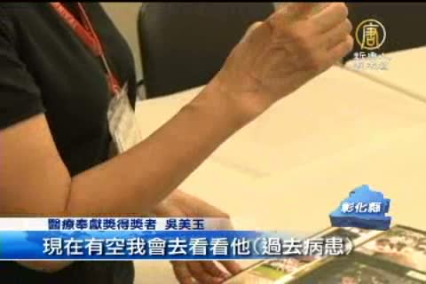 【新唐人亞太台2011年9月30日訊】一般人因為對精神疾病沒有正確的認識和瞭解,所以遇到精神病患者通常是敬而遠之,但是卻有這麼一個人,奉獻生命中超過四十年的歲月,照顧精神病患。視病如 親的他,最近獲得「醫療奉獻獎」。我們一起來看看,吳美玉女士的故事。