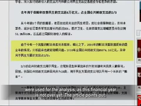 《人民日報》9月30號刊登了記者李麗輝的文章,文章說,由於今年一個完整的財政年度還沒有結束,所以用去年(2010年)的財政決算資料來分析。文章指出,2010年中國公共財政支出89874.16億元,其中用於民生方面的支出佔2/3。