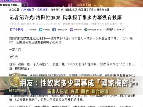 【新唐人2011年10月1日訊】率先報導洛陽「性奴案」的《南方都市報》記者紀許光近日發表文章披露,他所掌握的情況遠比已經公布的要多,但不得不做「保密處理」。有網友則在網上爆出嫌犯李浩的家庭中有多位軍隊和當地的官員。究竟這個性奴案還有多少「國家機密」,網友們期待一個回答。