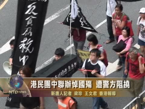 【新唐人2011年10月2日訊】趁著十一國殤日,香港民間團體成員手抬棺材,遊行到中聯辦前,要求中共釋放維權人士。香港警方在中聯辦前豎起重重鐵馬阻撓示威,雙方一度發生衝撞,並抬走部分示威者。