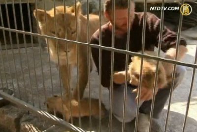 【新唐人2011年10月2日訊】新聞週刊(289)佩利申科是烏克蘭一傢俬人動物園的園長,他在籠子裏和一頭母獅以及它的幼崽們「共同生活」了五個星期,現在,佩利申科(Oleksander Pylyshenko)打包離開了他這位令人膽戰心驚的「室友」--一頭母獅。佩利申科是這傢俬人動物園的園長。他希望通過這一「創舉」來募款,同時呼籲人們關注野生動物。