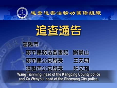 《追查迫害法輪功國際組織》今年6月發佈追查通告,對瀋陽市康平縣政法委書記劉景山、康平縣公安局長王天明、瀋陽市公安局長許文有等人立案追查。
