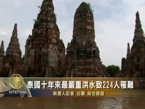 【新唐人2011年10月4日訊】泰國官員星期二(10月4日)表示,泰國遭遇了10年來最嚴重的雨季洪水,災害已經造成224人死亡,並影響到泰國3/4的地區,其中阿育他雅府(Ayutthaya)古城部分地區也受到影響。