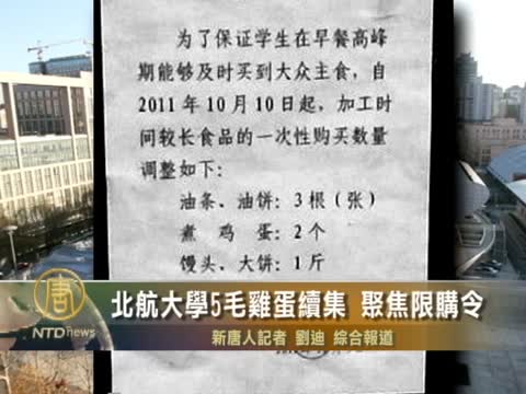 【新唐人2011年10月5日訊】中共總理溫家寶10月初探訪北航大學食堂,用餐學生聲稱煮雞蛋一個5毛錢。這個消息經媒體報導後,引髮網友熱議,很多網友反映5毛雞蛋太便宜,呼籲一起到北航吃早餐。不過,近日網友披露,北航已經貼出限購雞蛋的通知。