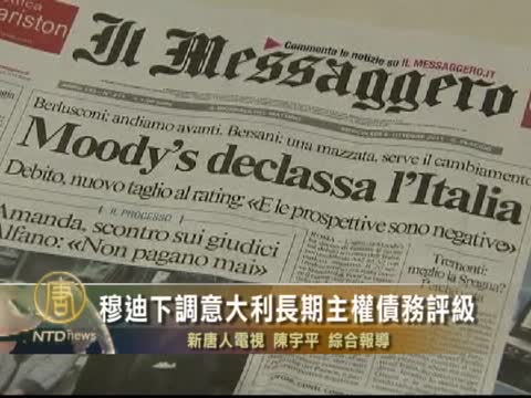【新唐人2011年10月5日訊】信用評級機構穆迪星期三將意大利長期主權債務評級下調三檔,從“Aa2”降級到“A2”,評級展望為“負面”。