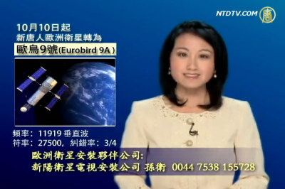 親愛的歐洲觀眾朋友,感謝您多年來對新唐人的支持,我們全球員工將更加努力為您帶來更精彩的節目。最後再次提醒您,10月10日以後,歐洲的新唐人節目不再通過熱鳥六號,只通過鷗鳥9號衛星播出。請您在此之前抓緊調整您的衛星接收裝置。更多信息參見本臺網站的收視指南。