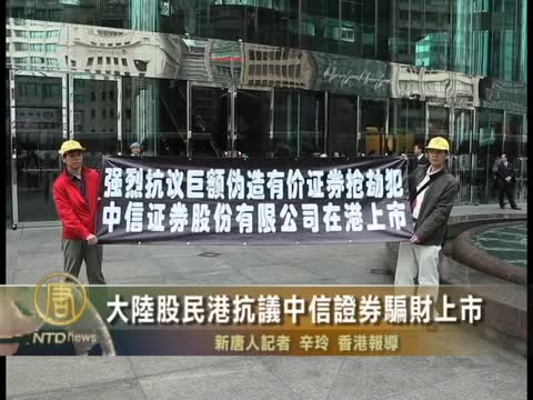 【新唐人2011年10月8日訊】中信證券股份有限公司10月6日在香港發行H股,掛牌首日就遇到專程來港抗議的大陸股民。他們控訴以中信為首的26家券商公開偽造南航證券,騙取股民千億計的血汗錢。