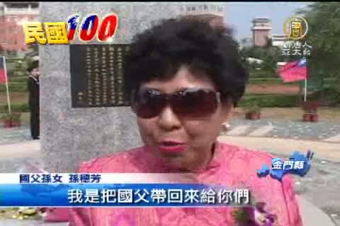 【新唐人亞太台2011年10月8日訊】中華民國建國100年國慶日即將到來,國父孫中山的孫女孫穗芳在昨日訪問金門,替捐贈給金門大學的國父銅像揭幕。針對近來中國大陸拍攝的辛亥革命電影,孫穗芳在接受訪問時說,中國大陸向來都沒有正視辛亥革命史實,她認為,相關歷史還是由台灣來詮釋較為適當。
