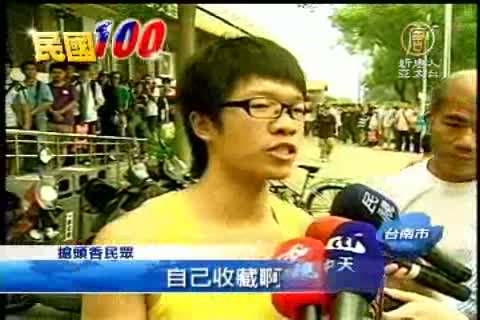 【新唐人亞太台2011年10月10日訊】民國百年雙十國慶,台鐵台南永康到保安站,發行五萬張永保安康限量車票,一早永康站就有大排長龍人潮等著搶購,排了三天搶到頭香的民眾,直呼太珍貴了,手上這張可是非賣品,但也有大學生說,買到之後,要賣掉,想趁機賺一筆。
