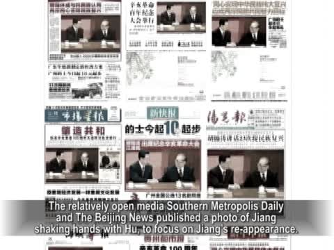 【新唐人2011年10月12日訊】現年85歲的江澤民將近兩年沒有在國內媒體露過面,10月9號亮相北京紀念辛亥革命大會,中共黨媒繼續低調處理,國內網民被禁止發表評論。海外媒體則紛紛聚焦江再度現身,以及對中共權力鬥爭的影響,也有外媒指出,胡錦濤很可能會效仿江,十八大後繼續執掌軍權。